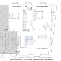 Das 100qm große Appartement im Schloss verfügt über 2 Schlafzimmer (eines davon offen zum Wohnraum), ein Wohnzimmer mit Küche, sowie ein Badezimmer.